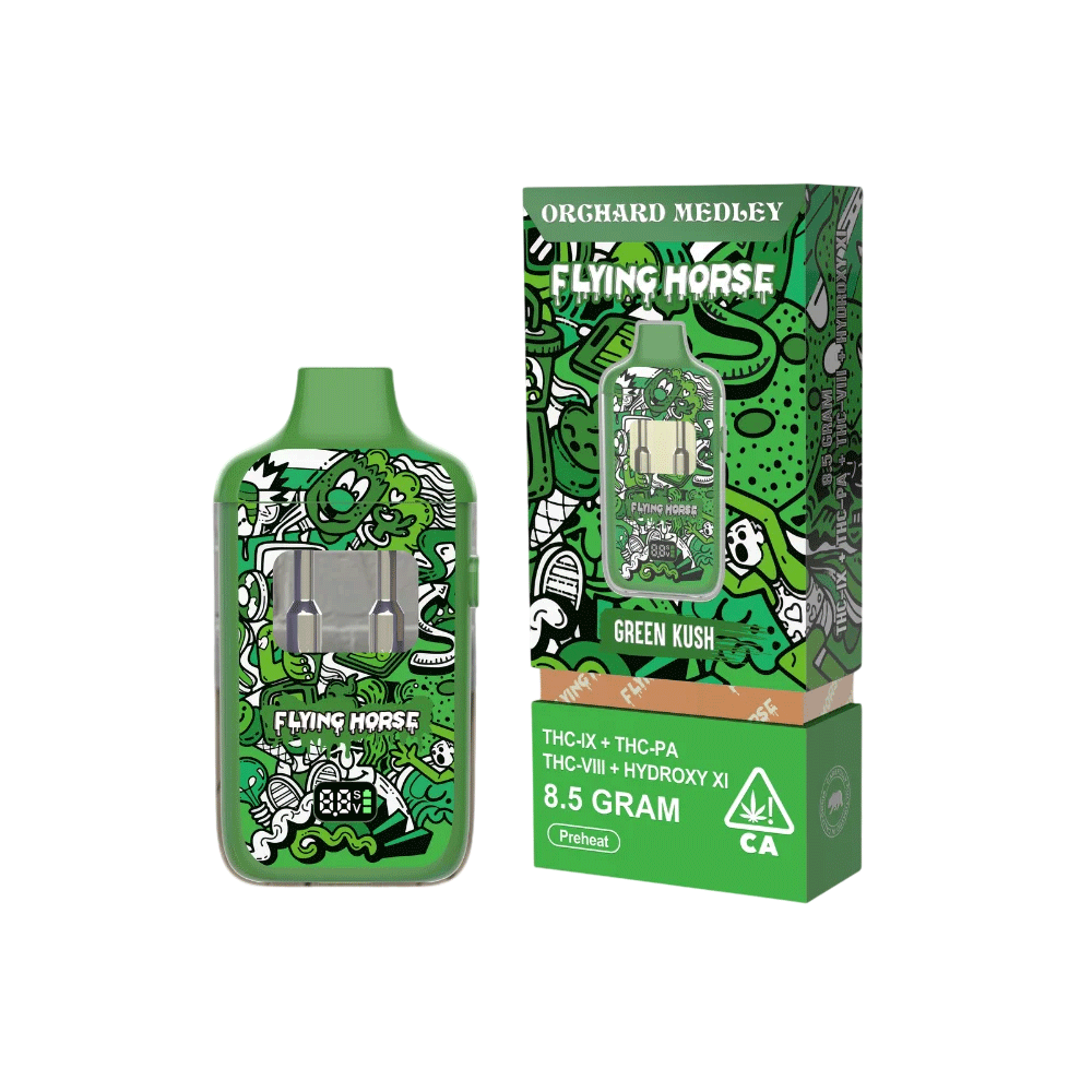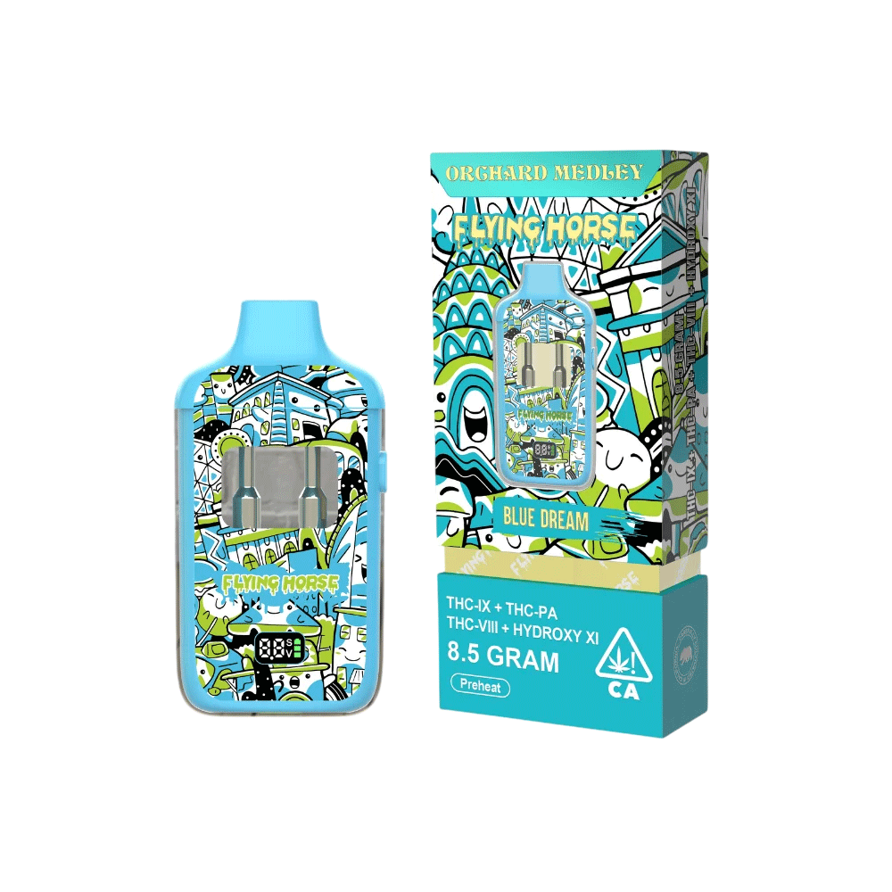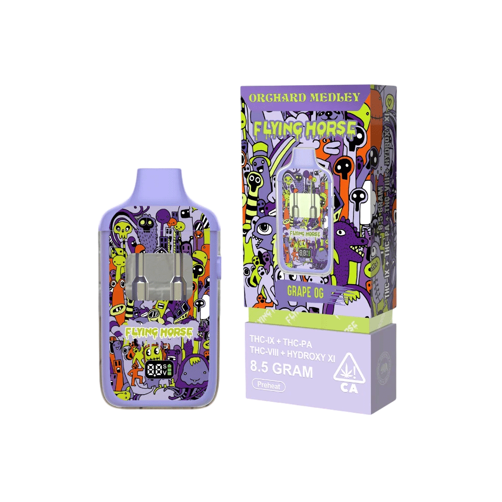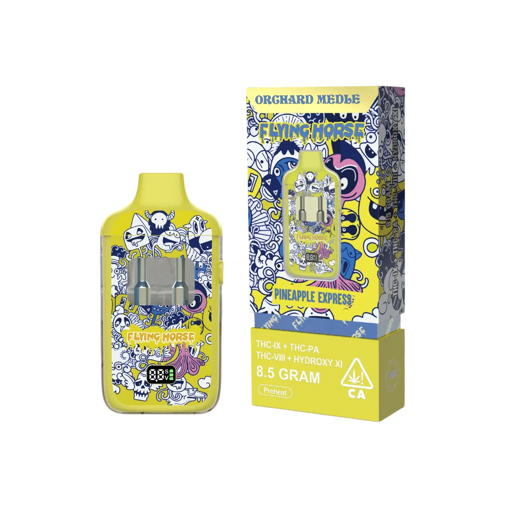 The latest addition to the Flying Horse disposable lineup is the 8.5g Flying Horse Orchard Medley Blend Disposable. This innovative blend, following the success of the Flying THC Waka Waka Blend Disposable 7g, offers powerful and long-lasting effects with vibrant flavors. The Flying Horse team is always seeking ways to push the envelope, whether through upgraded hardware or a unique hemp-derived cannabinoid blend. The Orchard Medley Blend features a carefully hand-selected blend of strains for an unparalleled combination of flavor and full-spectrum effects. With a highly potent yet balanced 8.5g blend of THC-IX, THC-PA, THC-VIII, Hydroxy XI, and all-natural terpenes, this blend seamlessly combines fast and slow-acting cannabinoids for a premium THC experience. And with a comfortable device design and intuitive features, this new disposable line is a must-try for hemp enthusiasts seeking a top-notch experience.
